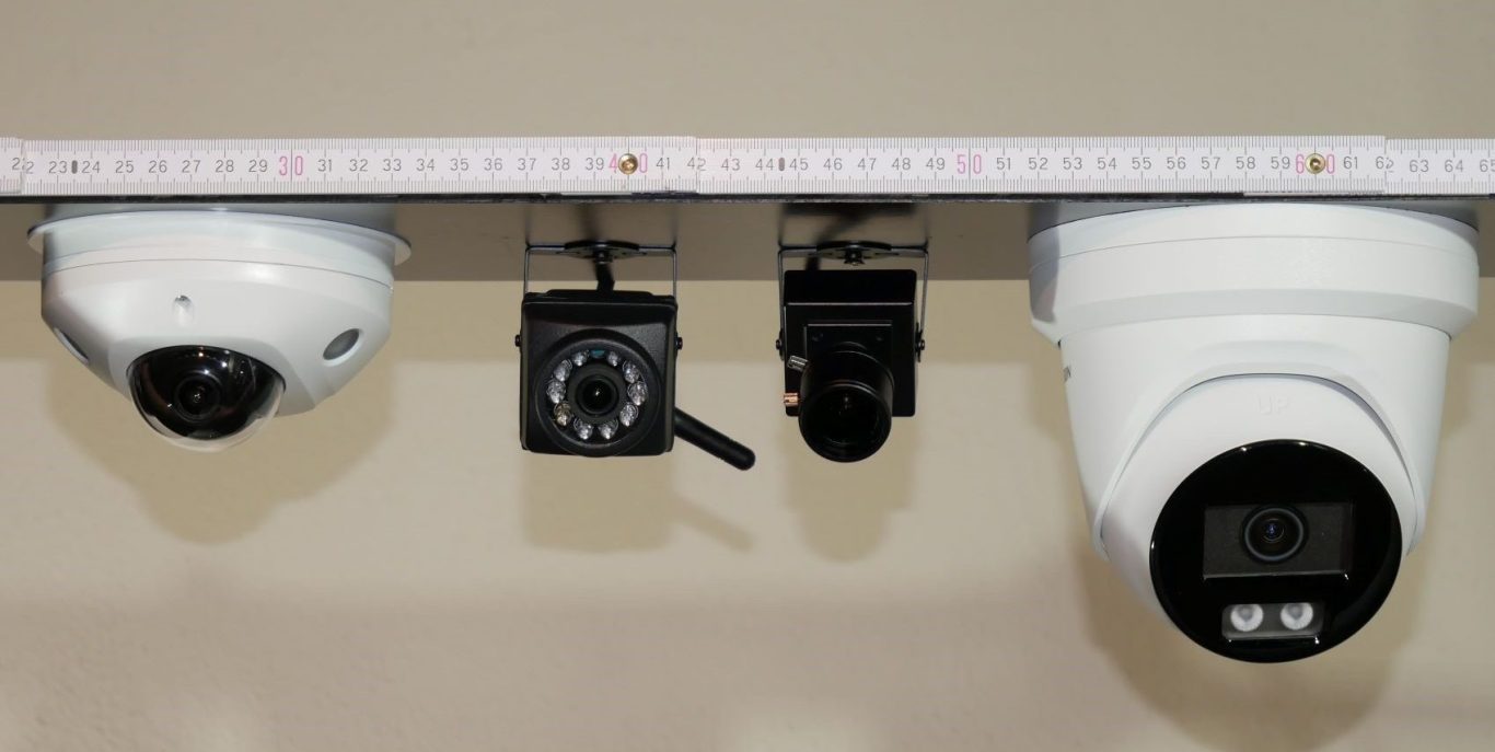 von links nach rechts: Dome-Kamera, WLAN-Kamera mit Infrarotscheinwerfer, Mini-Kamera, Turret-Kamera mit Infrarot- und normalem Scheinwerfer