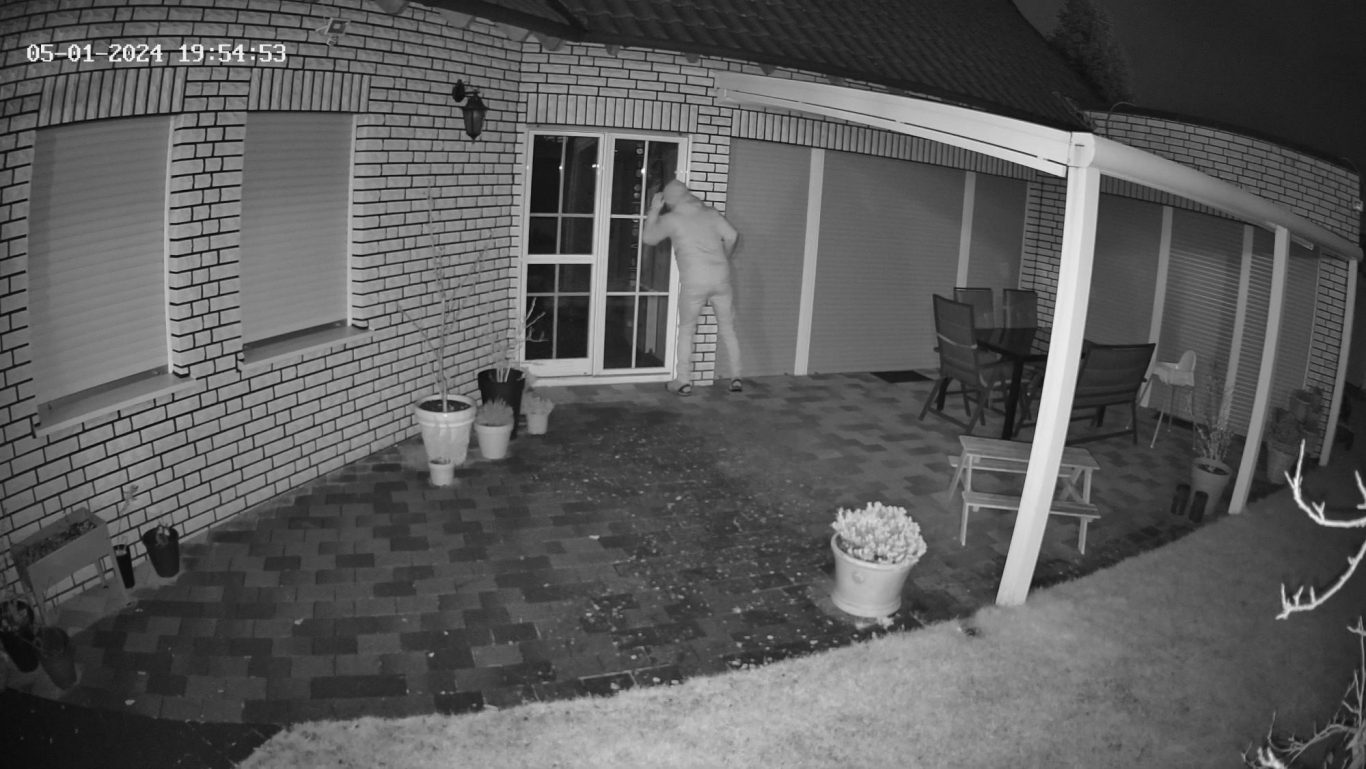 Originalaufnahme einer Überwachungskamera bei völliger Dunkelheit. Einzige Lichtquelle: Unsichtbarer Infrarotscheinwerfer der Kamera.